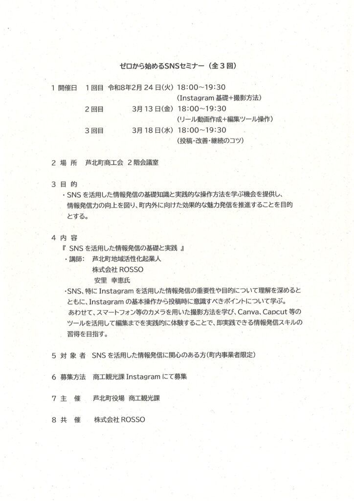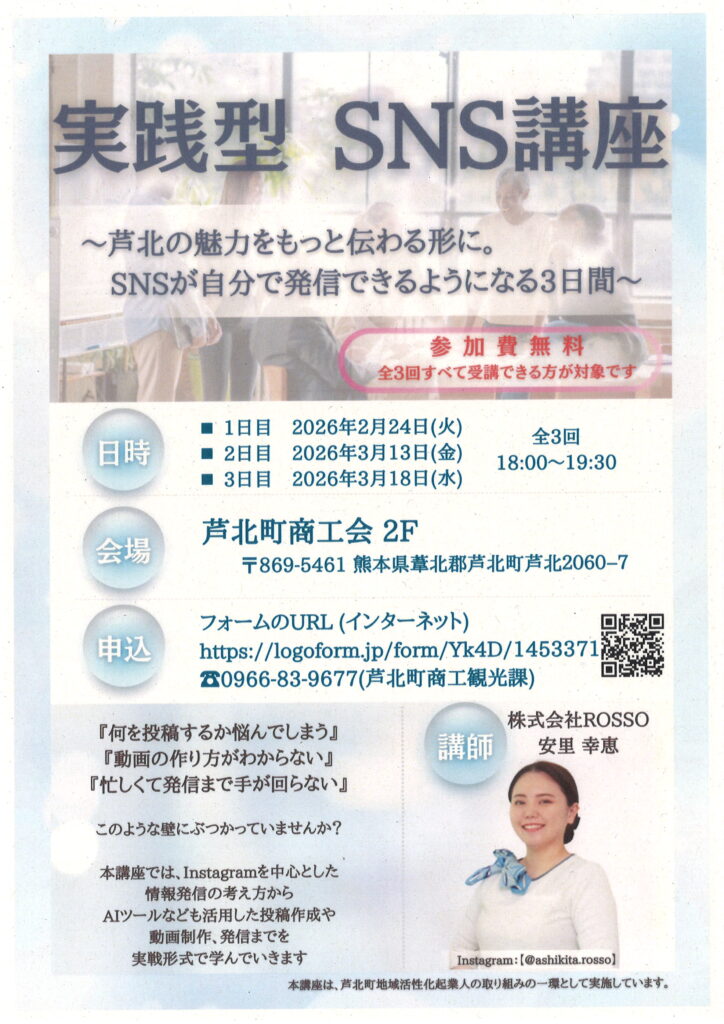 SNSを活用して、自社の魅力や情報を効果的に発信してみませんか? 基礎知識から、スマートフォンを使った撮影、編集ツールの操作まで、実践的に学べる全3回のセミナーを開催します。 ■セミナー内容 • 第1回:2月24日(火)18:00~19:30 ◦ Instagramの基礎知識と、スマホを用いた撮影方法 • 第2回:3月13日(金)18:00~19:30 ◦ リール動画の作成と、編集ツール(Canva、Capcut等)の操作体験 • 第3回:3月18日(水)18:00~19:30 ◦ 投稿のコツ、改善方法、継続して発信するためのポイント ■開催概要 • 場所:芦北町商工会 2階会議室 • 講師:安里 幸恵 氏(芦北町地域活性化起業人 / 株式会社ROSSO) • 対象:SNSを活用した情報発信に関心のある町内事業者様 • 主催:芦北町役場 商工観光課 ■お申し込み方法 別紙チラシのQRコード または ☎0966-83-9677(芦北町商工観光課)よりお申し込みください。![]()