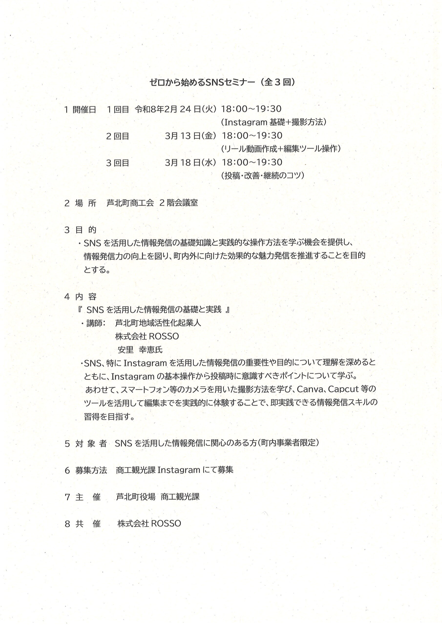 SNSを活用して、自社の魅力や情報を効果的に発信してみませんか? 基礎知識から、スマートフォンを使った撮影、編集ツールの操作まで、実践的に学べる全3回のセミナーを開催します。 ■セミナー内容 • 第1回:2月24日(火)18:00~19:30 ◦ Instagramの基礎知識と、スマホを用いた撮影方法 • 第2回:3月13日(金)18:00~19:30 ◦ リール動画の作成と、編集ツール(Canva、Capcut等)の操作体験 • 第3回:3月18日(水)18:00~19:30 ◦ 投稿のコツ、改善方法、継続して発信するためのポイント ■開催概要 • 場所:芦北町商工会 2階会議室 • 講師:安里 幸恵 氏(芦北町地域活性化起業人 / 株式会社ROSSO) • 対象:SNSを活用した情報発信に関心のある町内事業者様 • 主催:芦北町役場 商工観光課 ■お申し込み方法 別紙チラシのQRコード または ☎0966-83-9677(芦北町商工観光課)よりお申し込みください。![]()